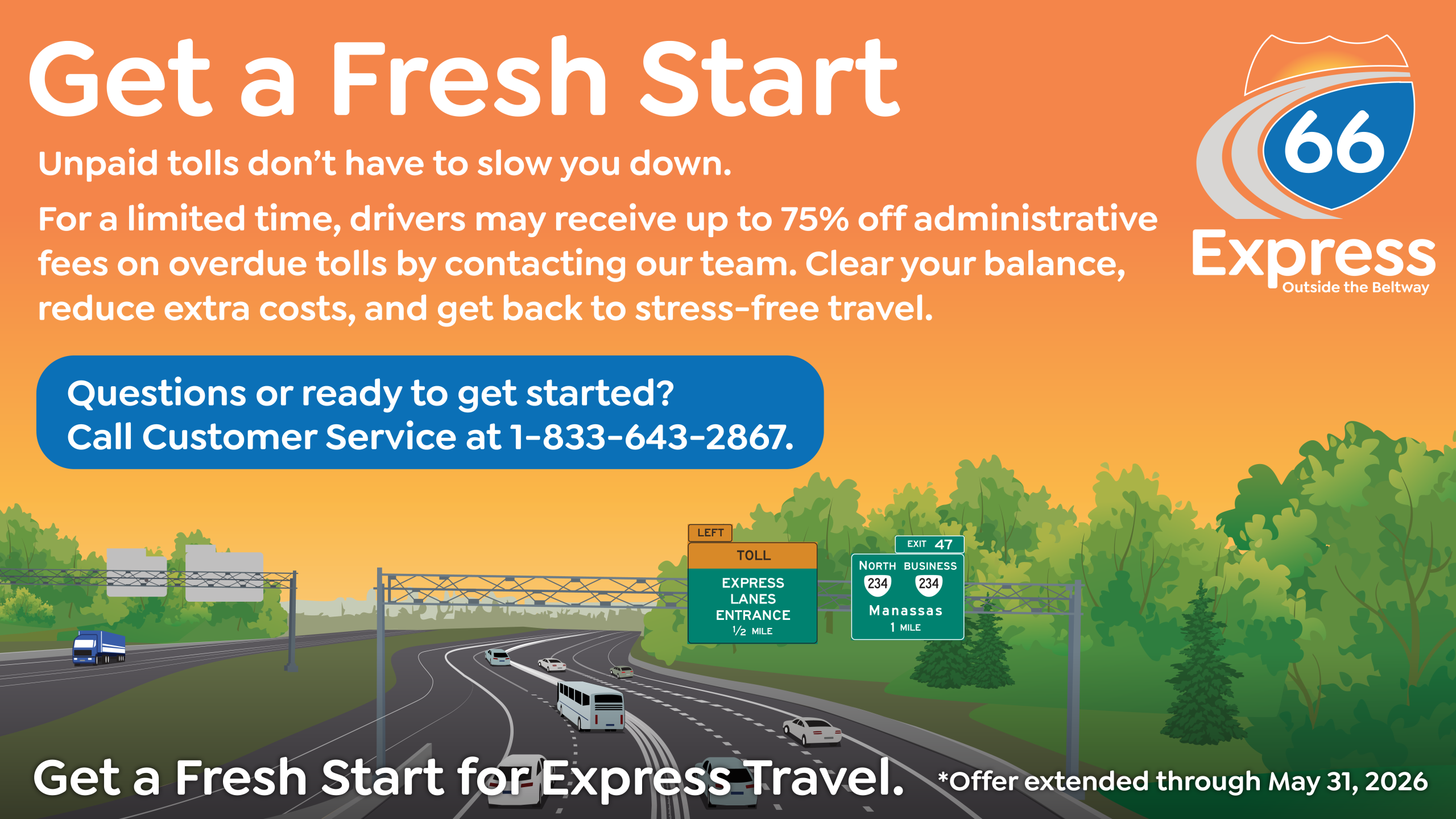 Part of VDOT’s Transform 66 Outside the Beltway program, the 66 Express Lanes are a transformative 22.5-mile multi-modal mega-project featuring advanced dynamic-tolling systems to keep traffic flowing at all times. The lanes provide Northern Virginia commuters, businesses, and mass transit with a reliable option to move people, goods, and services throughout the I-66 corridor, allowing drivers to Sit Less, Live More. Visit www.Ride66Express.com to learn more, and keep up with the 66 Express Lanes on Facebook and Twitter.